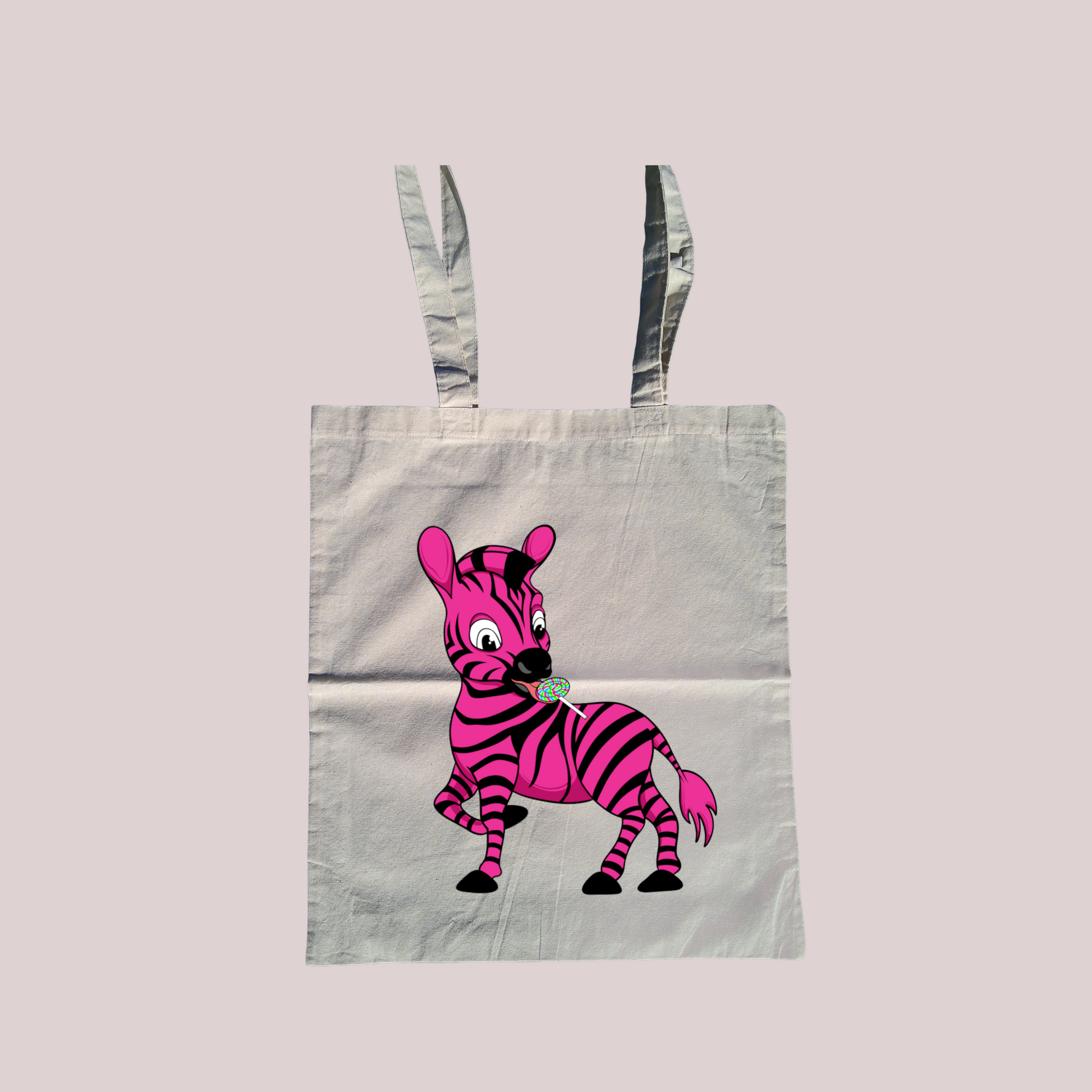100% cotton tote bag with fun image of a pink zebra with a lollipop printed on the front.